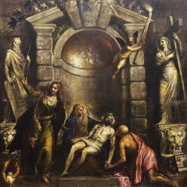 Tizian malte dieses düstere Werk, um sein eigenes Grab in der Kirche der Frari zu schmücken. Es widerspiegelt die trübe Laune des Künstlers in seinen letzten Lebensjahren – und möglicherweise auch die Stimmung in Venedig. Dort wütete gerade die Pest, deren Opfer auch Tizian wurde.