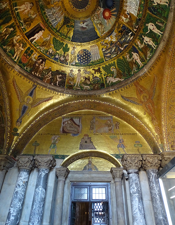Ein wunderschönes Mosaik in byzantinisch- venezianischem Stil ist in der Vorhalle (Narthex) zu sehen: Hier ist die Schöpfungsgeschichte in farbigen Einzelbildern festgehalten. Sie zeigen die Erschaffung der Erde, des Menschen und der Tiere, Szenen von Adam und Eva im Garten Eden, den Sündenfall, die Sintflut, die Arche Noah usw.
