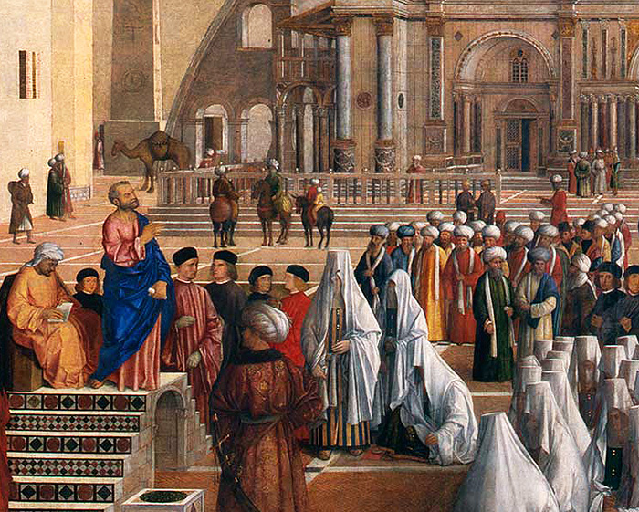 Markus predigt in Alexandria. Gemälde von Giovanni Bellini (1435-1516),Brera Milano.