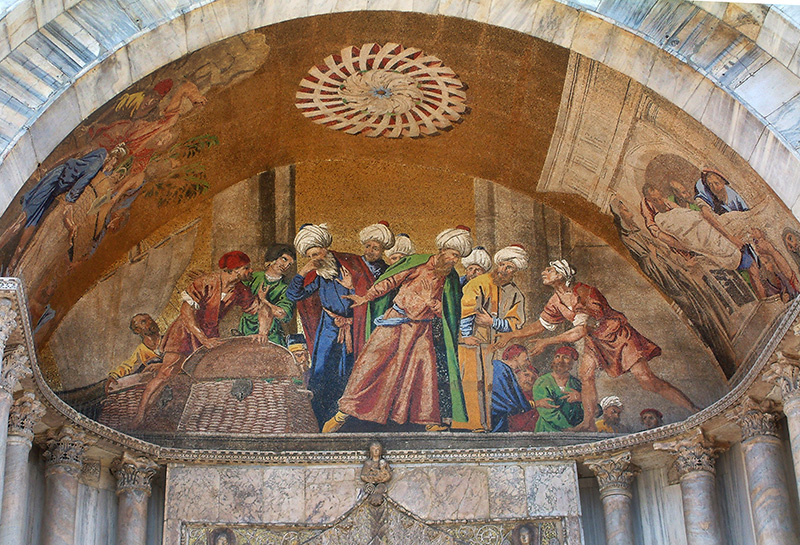 Es waren zwei venezianische Kaufleute, die auf Initiative des Dogen im Jahr 828 die Gebeine des Heiligen Markus im ägyptischen Alexandria stahlen und unter gepökeltem Schweinefleisch versteckt per Schiff nach Venedig entführten. Die Gebeine kamen am 31. Januar 828 in Venedig an.