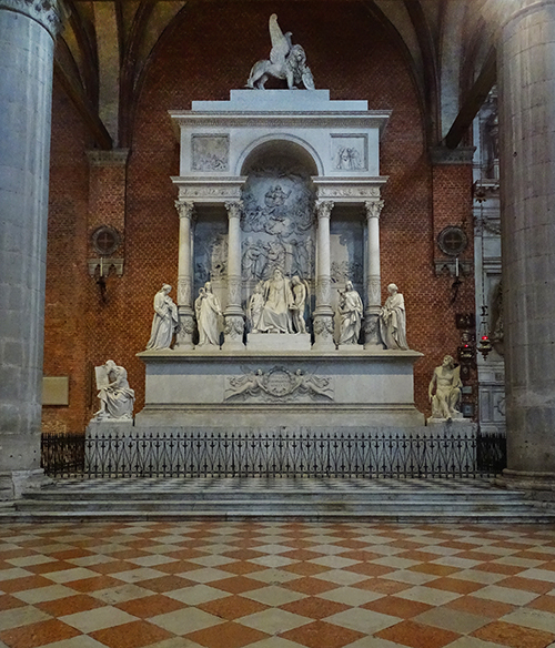 In der Frari-Kirche ist auch Tizians Grabmonument. Es war sein ausdrücklicher Wunsch, hier bestattet zu werden. Am 27. August 1576 wurde er in der Nähe des ihm heute gewidmeten Denkmals beigesetzt. Das Monument selbst wurde rund 300 Jahre nach seinem Tod an der Seite im Hauptschiff der Kirche platziert. Es besteht aus Carrara-Marmor und ist das Werk von Antonio-Canova-Schülern: Es sind dies die venezianischen Bildhauer Luigi und Pietro Zandomenghini (1806-1886). Auch für sie muss das Bild von Marias Himmelfahrt Tizians bedeutendstes gewesen sein: Sie haben das Motiv im zentralen Bogen in Marmor gemeisselt.