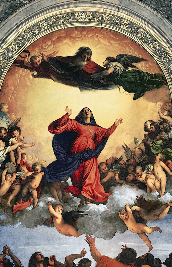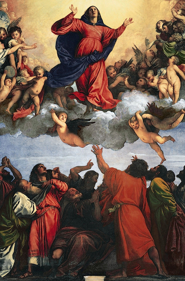 Als Tizian dieses Bild 1518 fertigstellt, wird es als Sensation gefeiert. Weil der Künstler den Aufstieg Mariens in den Himmel einzigartig darstellt. Die Jungfrau schwebt nicht einfach empor, sondern wird von Putten und Engeln auf einer Wolke empor getragen. Maria öffnet ihre Arme in Richtung Gottvater und die beiden blicken sich an. Mit diesem Werk setzt sich Tizian an die Spitze aller vor und nach ihm gemalten Himmelfahrten Mariens.