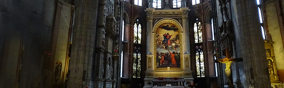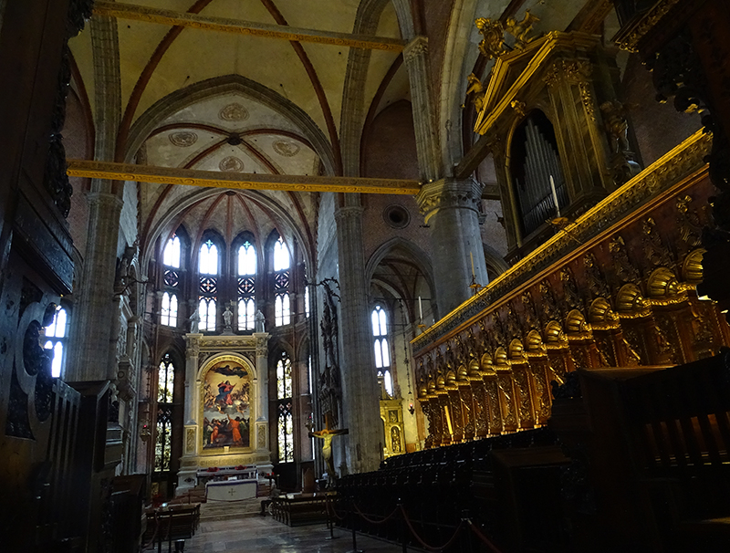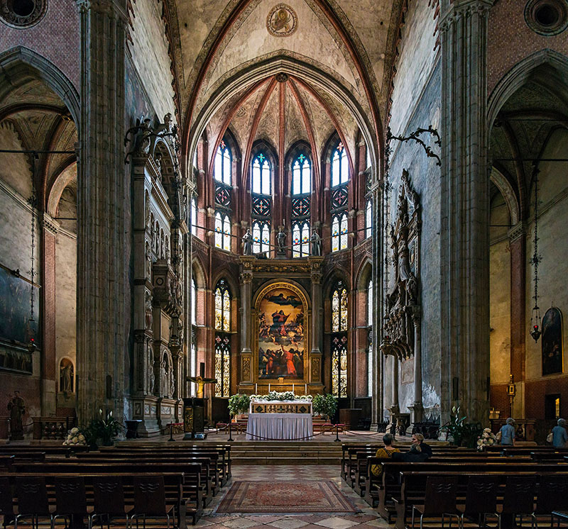 Die Kirche stand noch nicht lange – sie wurde erst gegen Ende des 15. Jahrhunderts fertiggestellt – als man 1518 Tizians Monumentalgemälde (7 Meter hoch!) über den Hauptaltar hängen konnte. Und seither betört dieses fantastische Werk die Venezier ebenso wie Touristen aus aller Welt. Seinetwegen hat man die Kirche 1926 in den Status einer Basilica erhoben.