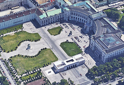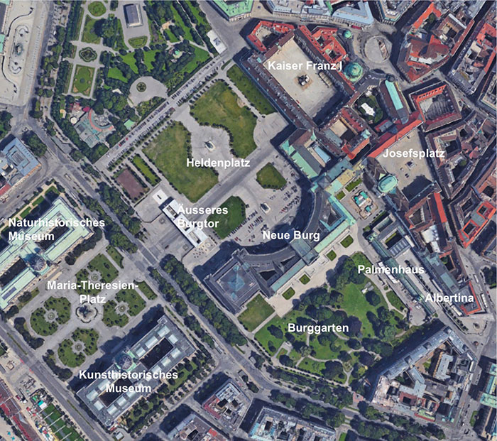 Der heutige Komplex besteht aus 19 Höfen und 18 Trakten! Das Luftbild von Google Earth zeigt nicht nur den Burgkomplex, sondern auch noch die zur Hofburg gehörenden Gebäude des Naturhistorischen und des Kunsthistorischen Museums ennet der Ringstrasse (links, beim Maria-Theresien-Platz).