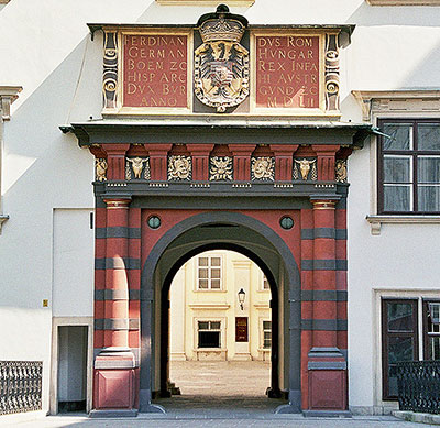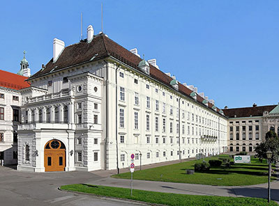 Der Leopoldinische Trakt wurde 1668-1680 für Kaiser Leopold I errichtet. Im 18. Jahrhundert bewohnte ihn auch >Kaiserin Maria Theresia. Nach ihrem Tod 1780 nutzte man die prunkvollen Räume für Repräsentationszwecke. Seit 1946 befindet sich hier der Amtssitz des österreichischen Bundespräsidenten. |
