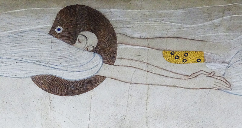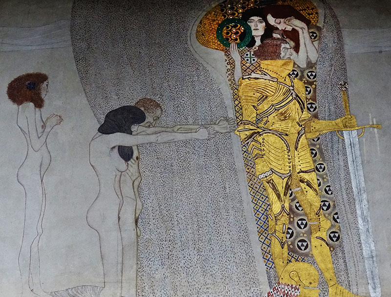Auf der linken Wand zeigt Klimt schwebende Genien. Deren Fluss wird von einer Figurengruppe unterbrochen, die aus nackten Menschen besteht – Symbole der leidenden Menschheit,