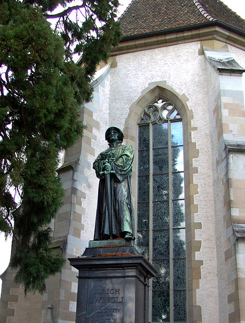 An der Rückseite der Wasserkirche steht das Denkmal des Zürcher Reformators >Huldrich Zwingli.