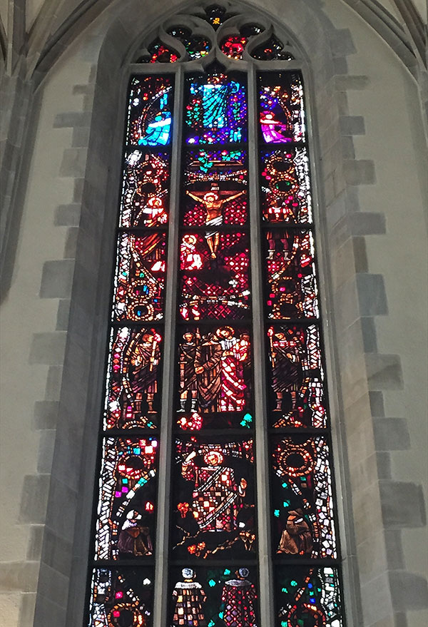 Das Mittelfenster zeigt das Leben Christi von Geburt bis zur Auferstehung.