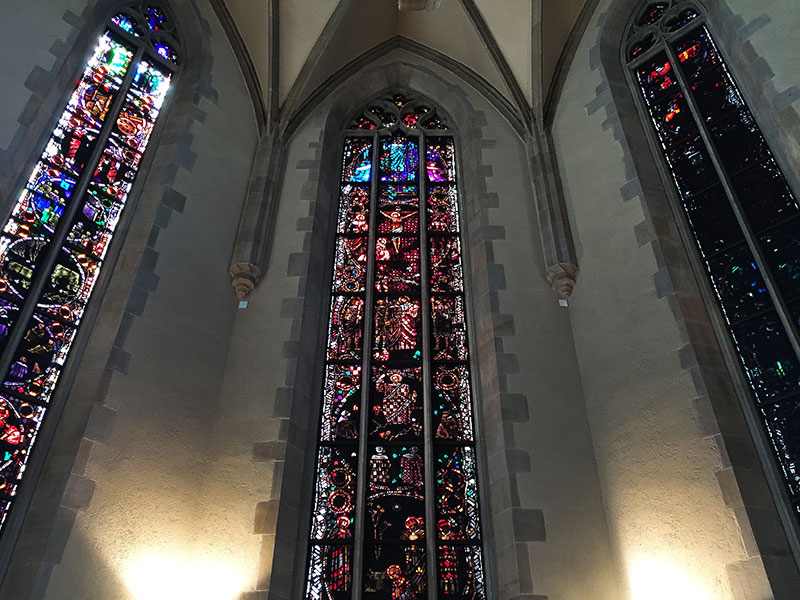 Die farbenfrohen Chorfenster sind nach Entwürfen von >Augusto Giacometti im Jahr 1942 vom St. Galler Glasmaler Ludwig Jaeger gefertigt worden. Die Motive sind für eine Kirche eher ungewöhnlich: sie zeigen nicht nur Christliches, sondern handeln auch von gewöhnlichen Normalbürgern.