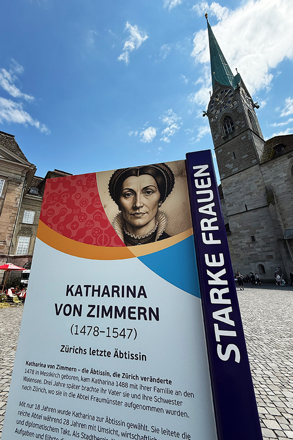 Unter den mächtigen Frauen sticht eine ganz besonders heraus: Katharina von Zimmern, die letzte Äbtissin des Fraumünsters. Sie galt als ranghöchste Zürcherin. Was sie geleistet hat, um in den Wirren der Reformation den Frieden zu bewahren, ist einmalig. Ihr freiwilliger Rücktritt im Jahr 1524 öffnete die Tür zur Reformation und verhinderte gewaltsame Auseinandersetzungen und Blutvergiessen. Ihre Bereitschaft, Macht abzugeben, ist Beispiel für Weitsicht und innere Grösse.
