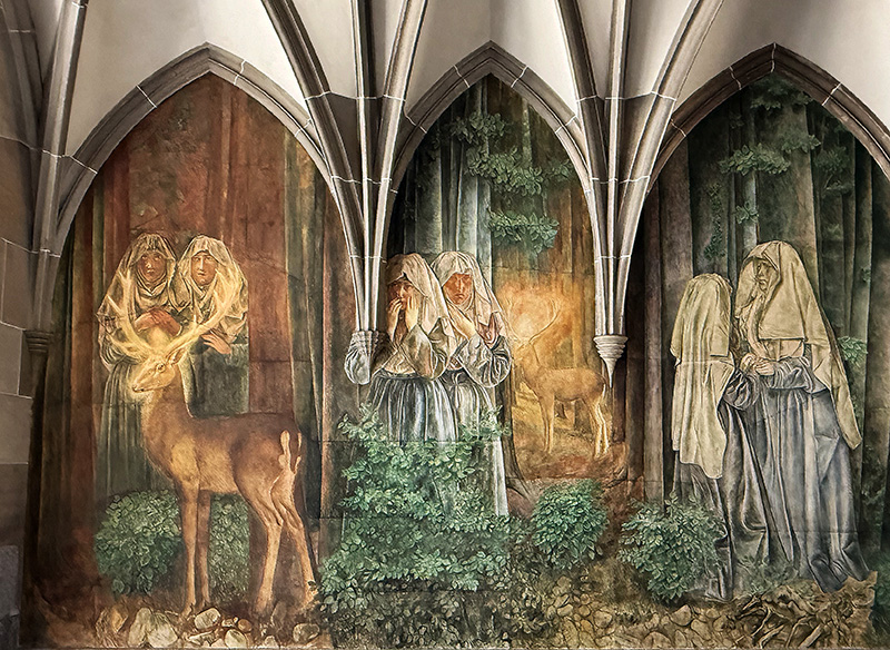 Berta, Hildegard und der Hirsch mit dem leuchtenden Geweih. Fresko