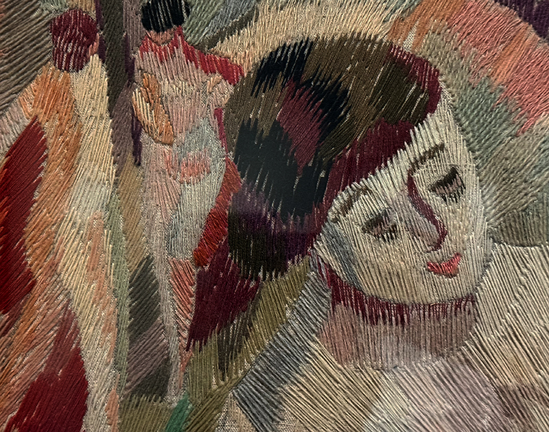 Bei dieser Technik werden bunte Wollfäden parallel auf Leinen genäht, um pinselstrich-ähnliche Effekte, Tiefe und Schimmer zu erzeugen. Mattes Garn dient für Kostüme, glänzende Seide für Haut.