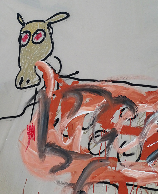 Die Silhouette der Figur wie auch jene der Kuh zeichnete der Künstler mit Sprüh- und Acrylfarbe. Danach füllte er den Körper des Tieres mit schnellen, groben Pinselstrichen.