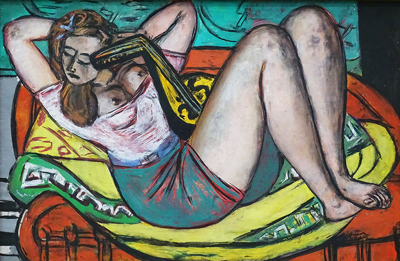 Auf den ersten Blick erkennt man eine verführerisch da liegende Frau mit mit entblössten Brüsten, die sich dem Betrachter öffnet. Gleichzeitig dreht sie aber ihren Kopf in eine Abwehrhaltung. Solche positiv-negativen Signale kommen in Beckmanns Werken immer wieder vor. Dieses Gemälde entstand in seinem Todesjahr.