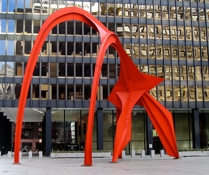 Noch mächtiger ist der 16 Meter hohe Flamingo. Er befindet sich auf der Federal Plaza in Chicago, ist aus 50 Tonnen Stahl gefertigt und zinnoberrot. Diese Farbe wird inzwischen auch als Calder-Rot bezeichnet.