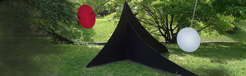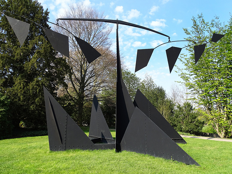 Dieses Werk steht in der Schweiz, im prächtigen Skulpturenpark der >Fondation Gianadda im Wallis. Es vereint die beiden ikonischen Schöpfungen Calders, das Mobile und das Stabile. Die Basis besteht aus einer fixem Stahlkonstruktion, der obere Teil ist frei schwingend und kann sich spielend im Wind bewegen.