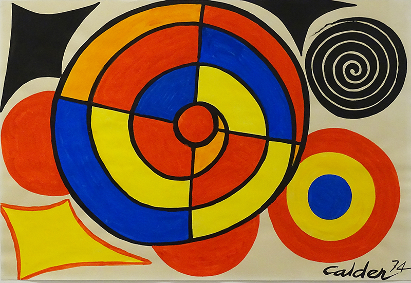 In Calders Spätphase entstehen zwar noch immer grosse Skulpturen, aber auch kleinere Arbeiten wie Schmuck, Grafiken und Gemälde. Diese enthalten oft Elemente von >Piet Mondrian.