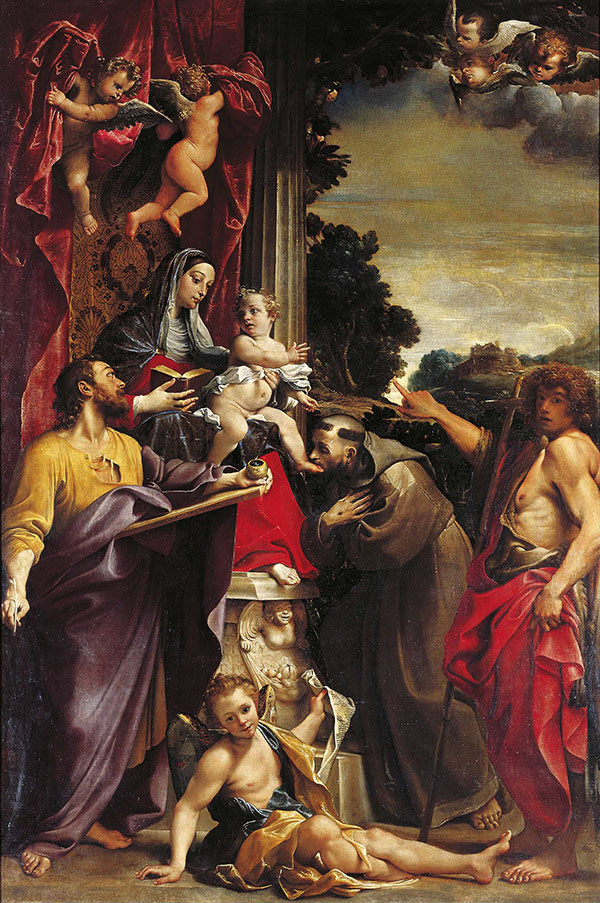 Für Kirchen in der Lombardei erhält Carracci zahlreiche Aufträge. So auch in der Stadt Reggio nell'Emilia. In der Basilika San Prospero malt er ein fast vier Meter hohes Altarbild für die Kapelle eines wohlhabenden Kaufmanns. Es zeigt die thronende Madonna mit Kind und die Heiligen Franziskus, Matthäus und Johannes den Täufer.