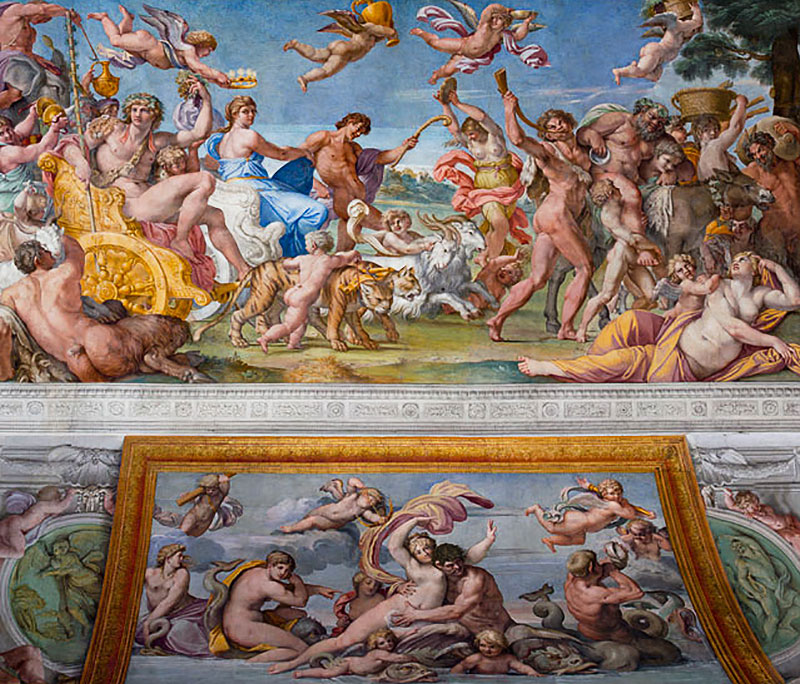 Die Deckenfresken in diesem Palast gehören zu den Hauptwerken von Annibale Carracci. Der Auftrag dazu kommt 1597 von Kardinal Odoardo Farnese. Das zentrale Fresko stellt den Triumphzug des Bacchus und der Ariadne dar, eingerahmt an den Seiten von Pan und Diane (links). Rechts überreicht der fliegende Merkur den goldenen Apfel an Paris. Die Arbeiten an den Fresken dauern bis 1605.