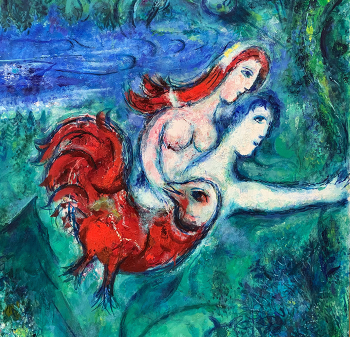 Chagall ist schon um die 70, als er dieses verträumte, verspielte und sinnliche Bild malt. Fast schon übersinnlich. Ein Liebespaar, roter Mond, mit Palmen und Vogel, mit Blumen und Kerzen.