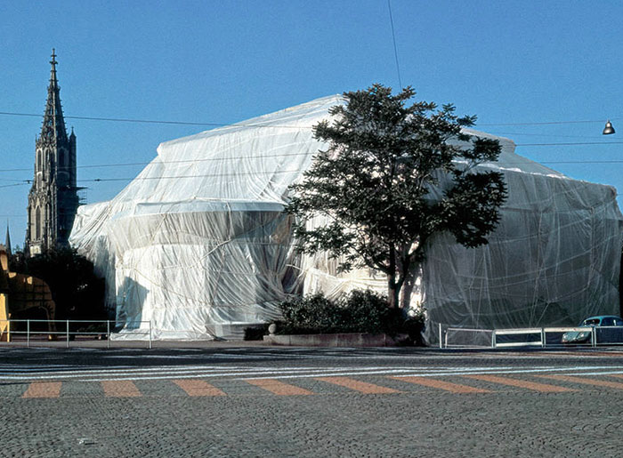 Was für eine Ehre: Ein Schweizer Kunstmuseum ist das erste Gebäude, das Christo und Jeanne-Claude umhüllen. Anlass dafür ist das 50-jährige Jubiläum der Berner Kunsthalle. Dieses wird 1967 mit Umweltwerken von zwölf Künstlern gefeiert.