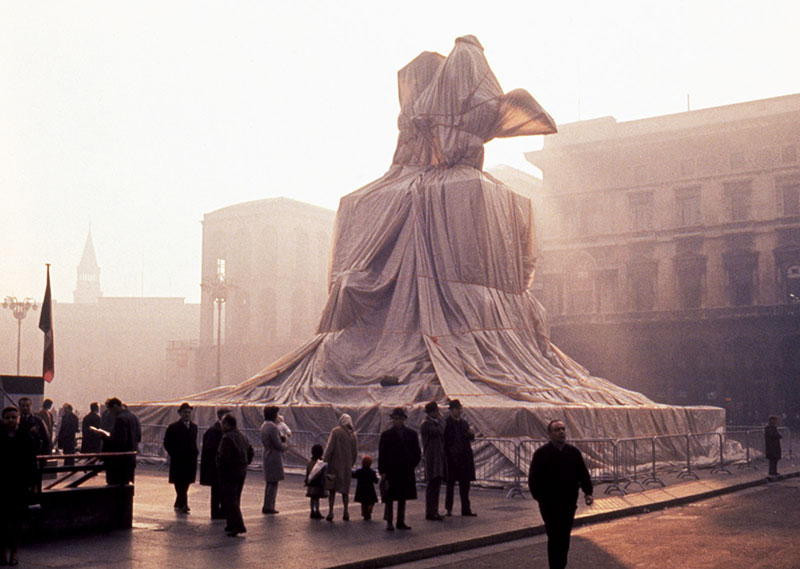 Bei dieser Aktion wird nicht nur Italiens König Vittorio Emanuele II auf der Piazza del Duomo in Mailand eingepackt, sondern gleich auch noch das Denkmal für Leonardo da Vinci auf der Piazza della Scala. Beide Monumente werden mit Polypropylen-Gewebe und rotem Seil umwickelt.