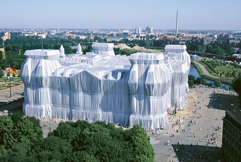 Ein Vierteljahrhundert dauert die Planung für dieses Monsterprojekt. Das Berliner Reichstagsgebäude hat eine bewegte Geschichte hinter sich, obwohl es erst 1894 erbaut wurde. 1933 brannte es nieder, 1945 wurde es fast komplett zerstört, in den sechziger Jahren restauriert. Seit 1971 befassen sich Christo und Jeanne-Claude mit der Idee, dieses berühmte Haus einzukleiden – es wird ein langer Weg durch die Instanzen. Am 24. Juni 1995 ist das Werk vollbracht. 120 Installationsarbeiter und 90 Kletterer bemühen sich darum. Der Reichstag bleibt zwei Wochen lang verpackt und generiert einen gewaltigen Publikumserfolg.