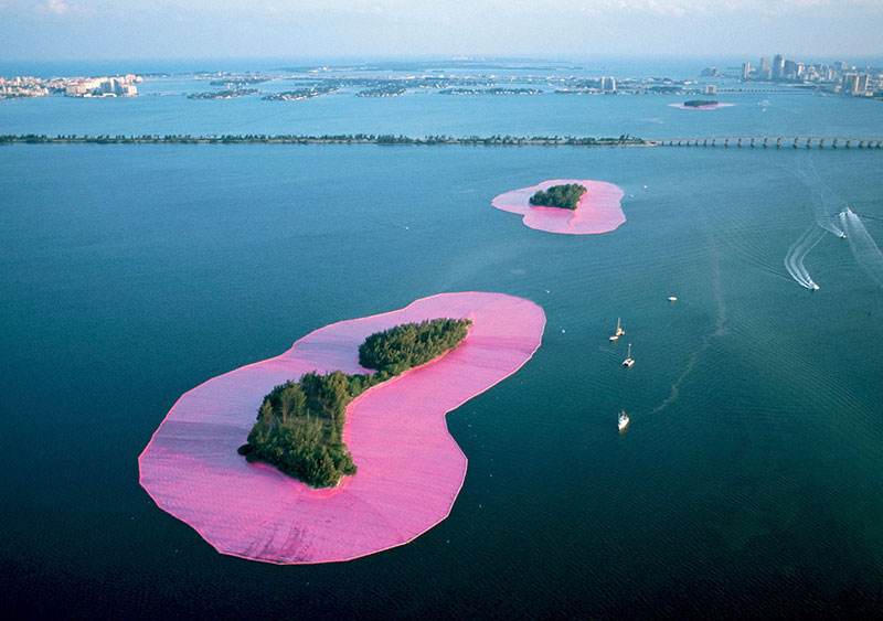 Türkisfarbenes Meer und ein kontrastierendes Rosa – was für ein Anblick, vor allem aus der Luft. Die Installation «surrounding Islands» wird am 7. Mai 1983 eingeweiht. Sie liegt in der Biscayne Bay zwischen Miami, Miami Shores und Miami Beach.