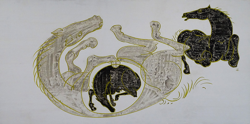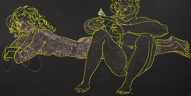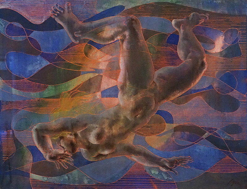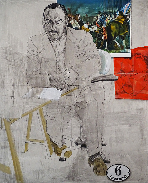 An Motiven mangelt es ihm nicht. Er interessiert sich für geisteswissenschaftliche und technische Dinge, für Errungenschaften der Menschheit, für Kultur und Sport. Diese Sujets verarbeitet er in seinem nun eigenen Stil: Figuratives in abstrakten Räumen, oft versehen mit seinen typischen weissen Konturen, die mit der Figur eine Symbiose eingehen.