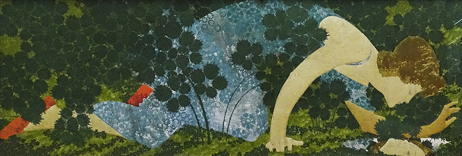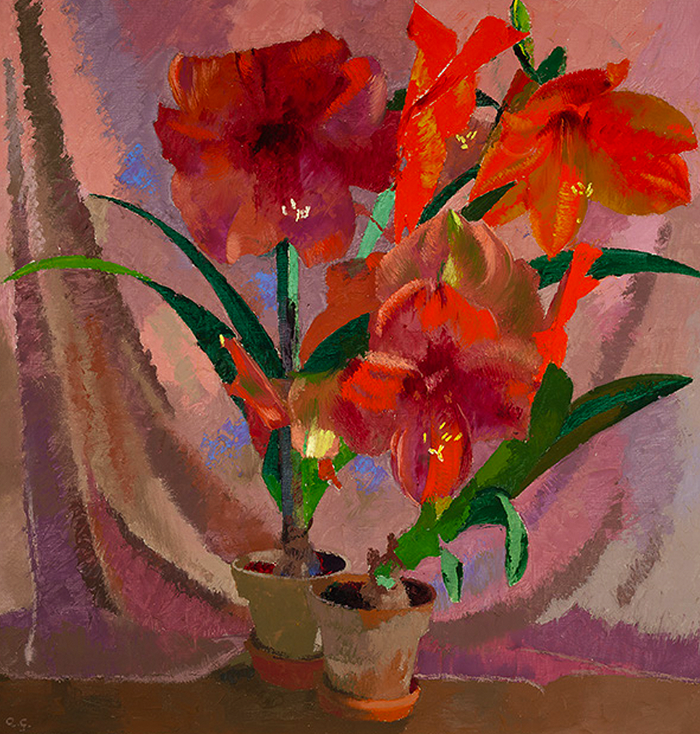 Es heisst Amaryllis (1947) und zeigt zwei überdimensioniert scheinende Pflanzen in ziemlich kleinen Tontöpfen. Die üppigen Amaryllis-Blüten in rotoranger Farbe kontrastieren mit schmalem grünem Blätterwerk. Auch hier vollendet der Künstler sein Werk mit einem arrangierten Hintergrund: Es ist ein rosafarbener Vorhang, der die Leuchtkraft der Blüten noch verstärkt.