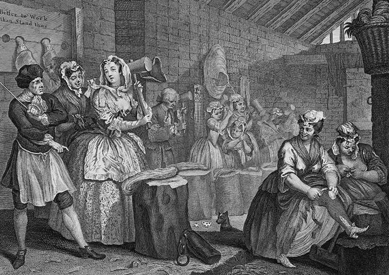 In Gemälden und Kupferstichen prangert er soziale Missstände in England an, aber auch banale tägliche Sitten und Mode. Wie die heitere Darstellung von Schauspielerinnen, die sich für ihren Auftritt als Göttinnen in einer Scheune umkleiden müssen («Strolling Actresses Dressing in a Barn»).