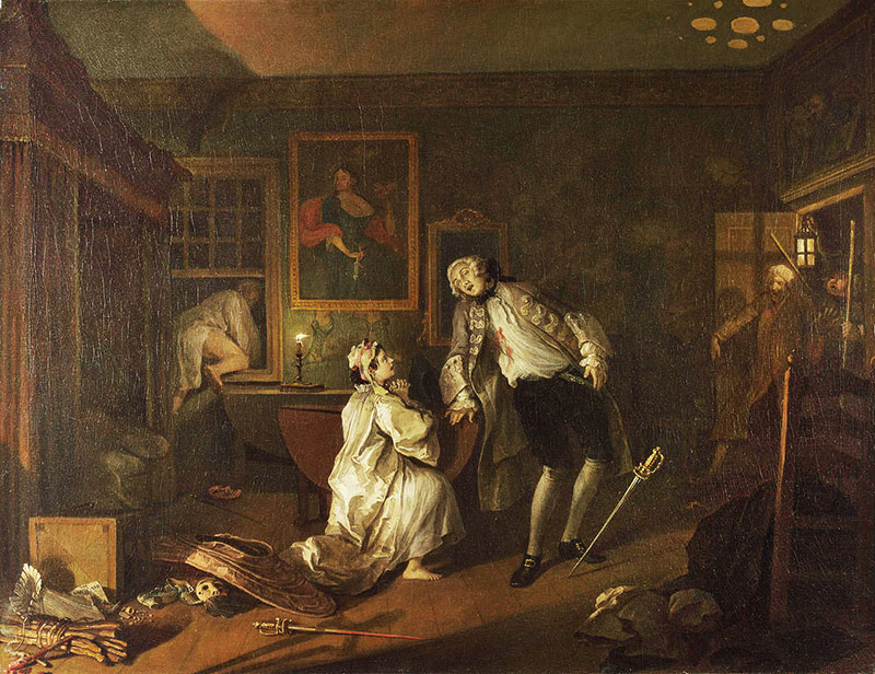 Berühmt wird er dann aber in den 1730er-Jahren mit seinen «Modern Moral Subjects». Das sind Bilderfolgen, in denen er Lebensläufe von fragwürdigen Personen darstellt, zum Beispiel eines Wüstlings («A Rake's Progress») oder eines Mädchens, das zur Hure gemacht wird und schliesslich an Syphilis stirbt («A Harlot's Progress»).