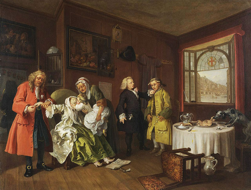 Hogarth wird 1697 in London in eine kleinbürgerliche Familie geboren. Sein Vater ist ein schlecht bezahlter Lateinlehrer. Er versucht, am St. Johns Gate ein lateinisch-sprachiges Kaffeehaus zu eröffnen. Das Projekt misslingt, stürzt ihn in Schulden und bringt ihn für fünf Jahre ins Schuldgefängnis «Fleet Prison». Derrweil lernt der junge Hogarth das harte Leben auf der Strasse kennen. Schon früh beginnt er damit, dieses in Skizzen festzuhalten. Er macht dann eine Lehre bei einem Graveur und Kupferstecher. Es folgen Ausbildungen zum Maler. Zunächst in einer privaten Malschule und schliesslich beim Hofmaler Sir James Thornhill. Er verliebt sich in dessen Tochter Jane, brennt mit ihr durch und heiratet sie heimlich.