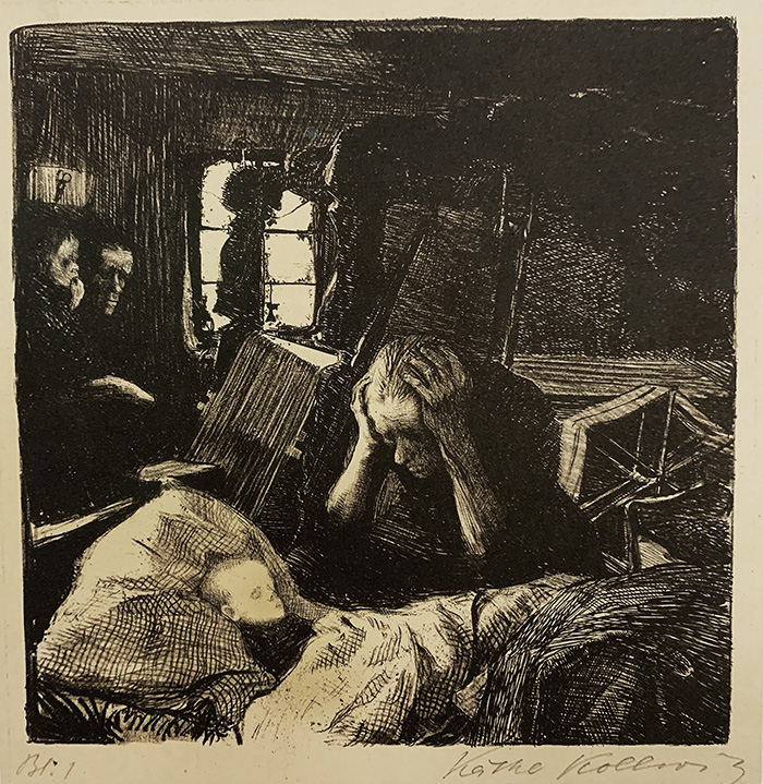 Inspiriert von Gerhart Hauptmanns Drama «Die Weber» schafft Kollwitz eine Serie Radierungen, die sich mit dem Aufstand von Webern auseinander setzt, der sich 1844 in Schlesien ereignete.