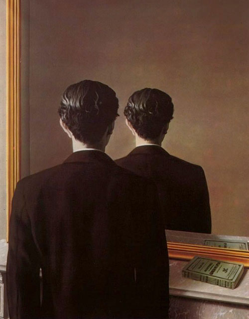 Im Bild Magrittes steht er vor einem Spiegel, aber er sieht sich darin von hinten... typisch Magritte.