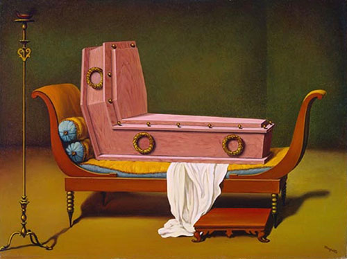 Der Sarg übt bei Magritte einen unwiderstehlichen Reiz aus. Sein Spiel mit dem sicher bevorstehenden Tod jedes Menschen hat ihn zeitlebens fasziniert. Die Skulptur des Sarges der «Madame Récamier» schuf er in seinem Todesjahr: 1967. Aber die Idee dazu hatte er schon 16 Jahre früher, als er sie zunächst in einem Gemälde verarbeitete.