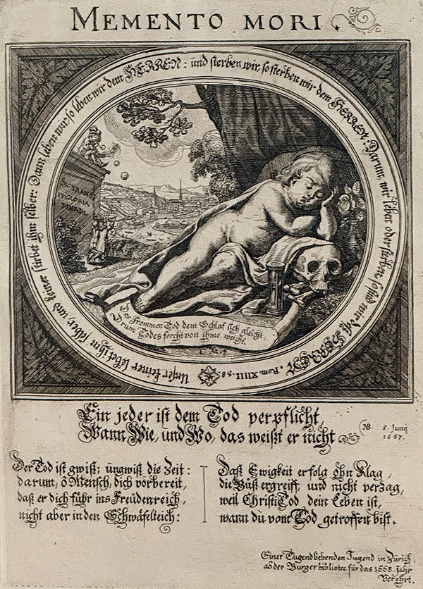 Das Neujahrsblatt von 1668 widmet er dem Thema Memento mori. Dieser lateinische Ausdruck besagt «Bedenke, dass du sterben musst» oder «Erinnere dich, dass du sterblich bist». Der Spruch stammt aus dem antiken Rom, wo ein Sklave einem siegreichen Feldherrn bei Triumphzügen zugeflüstert haben soll: «Memento mori». Manchmal wird der Spruch auch als «Memento te hominem esse» verwendet (Bedenke, dass du ein Mensch bist). Auch dies, um an die Vergänglichkeit erinnern.