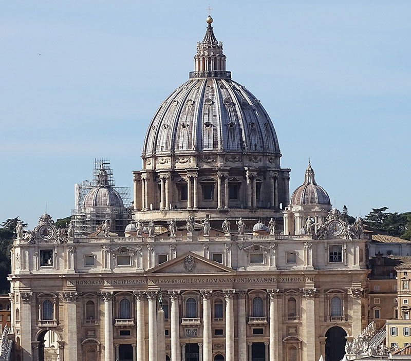1547 erteilt man Michelangelo die Bauleitung am Petersdom. Seine Pläne orientieren sich am ersten Architekten des Doms, Donato Bramante, der von 1504 bis zu seinem Tod 1514 daran arbeitet. Michelangelo gestaltet die Fassaden des Westbaus und die monumentale Kuppel. Die Fertigstellung der Kuppel erlebt er nicht mehr, er stirbt 1564.