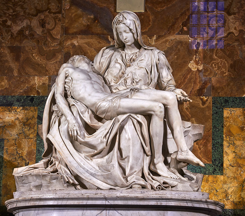 Maria mit ihrem toten Sohn auf dem Schoss. Aus Carrara-Marmor, geschaffen 1498-99. Was sofort auffällt: Das jugendliche Aussehen der Mutter. Sie hat das Gesicht eines Teenagers, dabei hält sie ihren erwachsenen toten Sohn im Arm. Michelangelo, auf das jugendliche Alter seiner Maria angesprochen, soll geantwortet haben: «Weisst du nicht, dass keusche Frauen sich viel frischer erhalten als die, welche es nicht sind?».