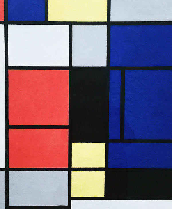 Seine schwarzen Raster mit den rechteckigen Flächen werden in der Folge zum Markenzeichen des Künstlers. Sie bestehen aus den Grundfarben (auch Primärfarben genannt) Rot, Gelb und Blau. Schwarz gilt als «Nicht-Farbe».