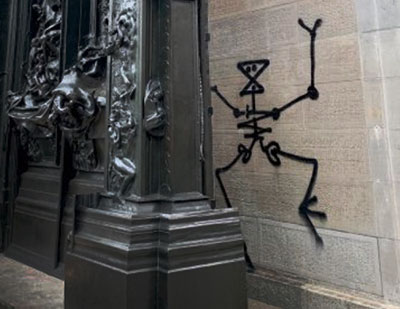 Nur ganz kurze Zeit im Juni 2020 war dieses Männchen hinter Rodins Höllentor beim Kunsthaus Zürich zu sehen – dann war es weggeputzt. Der Künstler kann das nicht begreifen. Dass ein Hauseigentümer, der mit Kunst nichts am Hut hat, die Sprayereien entfernen lässt, damit kann er sich abfinden. Aber dass ein Kunsthaus seine Werke nicht als Kunst versteht und ihn sogar noch verklagt, dafür hat Naegeli wenig Verständnis.