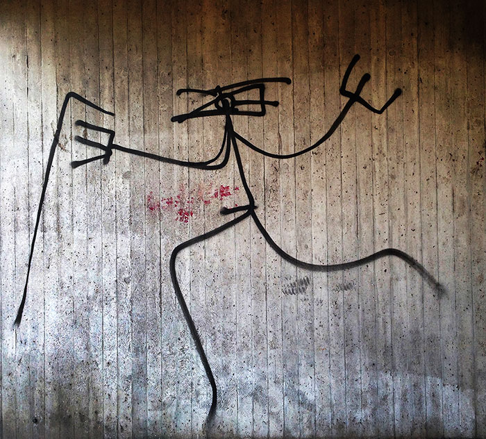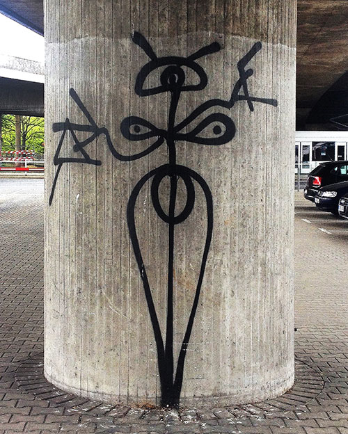 In den späten 70er-Jahren beginnt er dann, Zürichs Betonwelt mit Graffiti aus der Spraydose zu beehren: Mit seinen berühmten Strichmännchen, mit Frauenfiguren, mit Blitzen und Geistern, mit Fischen und Flamingos. Alle gesprayt in wenigen Minuten, meist genial der Umgebung angepasst. Etwa vierhundert bis sechshundert Kunstwerke. Die Hauseigentümer sehen das allerdings anders. Sie reichen Klage ein wegen «Eingriff ins Eigentum und Sachbeschädigung».