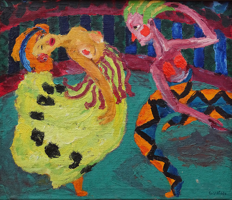 Besuche in Berlins Varietés hinterlassen Spuren. Noldes expressionistische Werke werden immer ungehemmter, die Figuren immer exzessiver. Seine Kreaturen sind schon fast surrealistisch, die Körper gekrümmt, die Gesichter zu Fratzen verzerrt. Der Harlekin und seine barbusige Tänzerin vewandeln ihren Pas de Deux in Akrobatik.