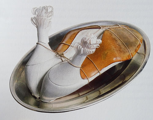 Auch dieses Werke wurde zur Ikone. Ein paar mit Schnur zusammengebundene Stöckelschuhe, weiss bemalt und mit verzierten Absätzen, präsentiert auf einem Silberteller. Ausgestellt an der Londoner «International Surrealist Exhibition» von 1936.