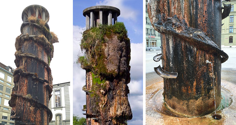 Obwohl dieser Brunnen aus Beton besteht, findet tatsächlich eine unaufhörliche Veränderung statt. Das ständig rieselnde Wasser sorgt für Tuffsteinablagerungen, die das Werk in der Form immer wieder verändern. Und die darauf wild wachsenden Pflanzen geben dem Turm ein ständig neues Aussehen.