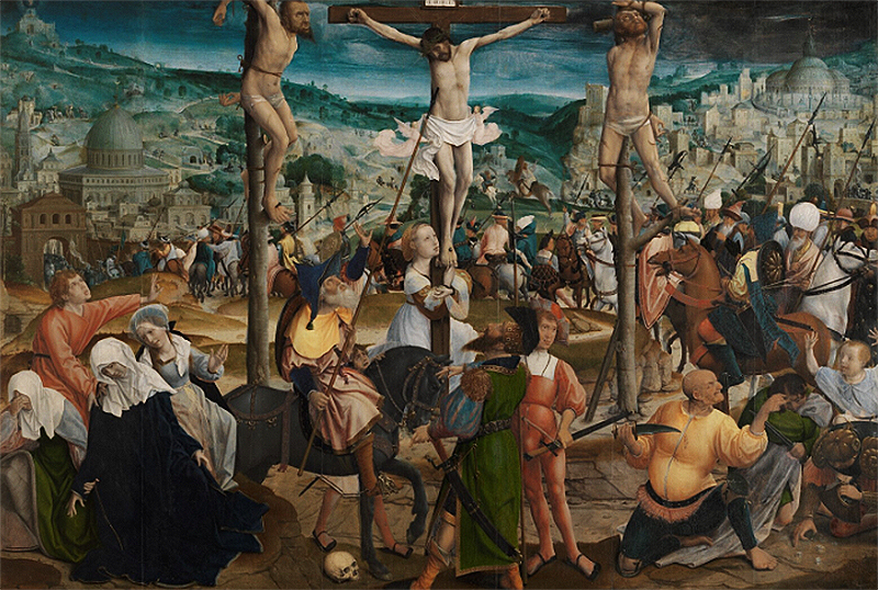 Provost zeigt in diesem Gemälde gleichzeitig mehrere Geschichten: Christus hängt noch am Kreuz, wird aber gleichzeitig am Grab beweint. Als weitere Elemente packt der Künstler den Tempel von Jerusalem und die ferne Stadt dazu. Dunkle Wolken verstärken die düstere Stimmung der Kreuzigung.