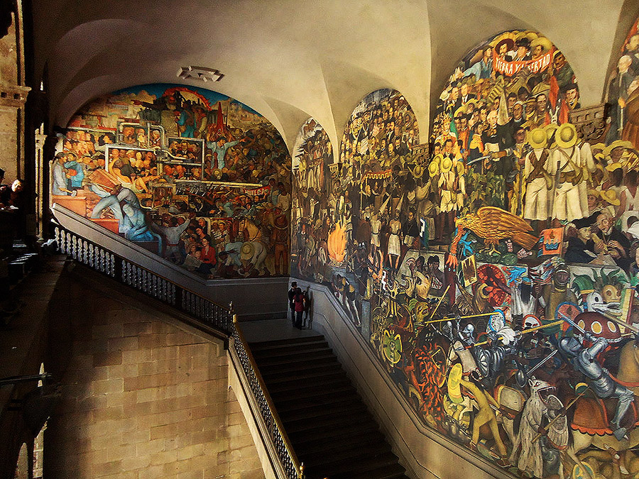 wird er vor allem durch seine Wandbilder, die «Murales», die er übergross in zahlreichen öffentlichen Gebäuden Mexikos anbringt. Sie erzählen eine dramatische Geschichte des Landes – viele davon haben sozialkritische Inhalte. Diego Rivera steht zeitlebens der russischen Revolution nahe und ist Mitglied der kommunistischen Partei Mexikos.