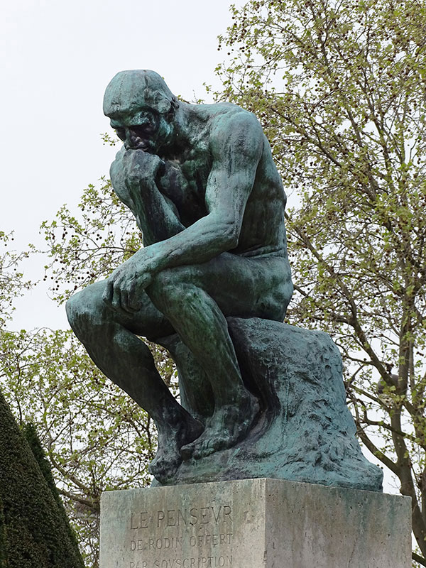 1888 stellt Rodin ein Kleinformat der Skulptur in Kopenhagen aus und 1902 schafft er eine zwei Meter hohe monumentale Version davon, die an Werke von Michelangelo erinnert. Der denkende Muskelprotz. Im Laufe der Zeit sind mehr als zwanzig Abgüsse davon erstellt worden. Dieser hier steht im Park des Musée Rodin in Paris, eine weitere Kopie im Rodin-Museum in Meudon. Und auch der Vatikan besitzt ein Exemplar.