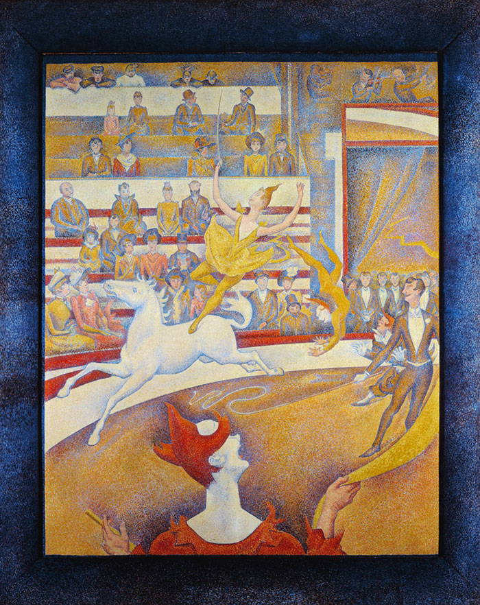 «Le Cirque» wird im März 1891 im Salon des Indépendants ausgestellt – in unvollendetem Zustand. Stellenweise ist der weisse Grund noch sichtbar. Der blaue Rahmen gehört zum Bild, vom Künstler gemalt. Georges Seurat stirbt nur wenige Tage nach der Ausstellung.