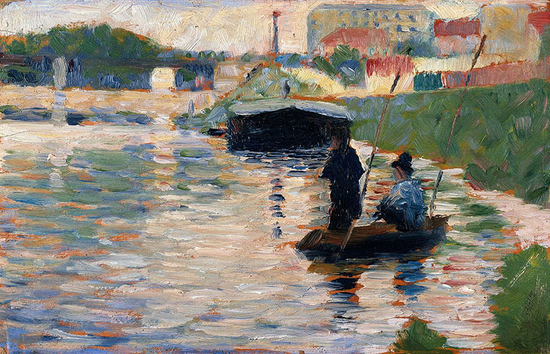1879 besucht Seurat in Paris die Ausstellung der Impressionisten, in der Monet, Degas und Pissarro zu sehen sind. Der eben in Mode gekommene neue Stil >Impressionismus fasziniert ihn – nun wendet er sich diesem zu und löst sich langsam vom klassischen Stil.